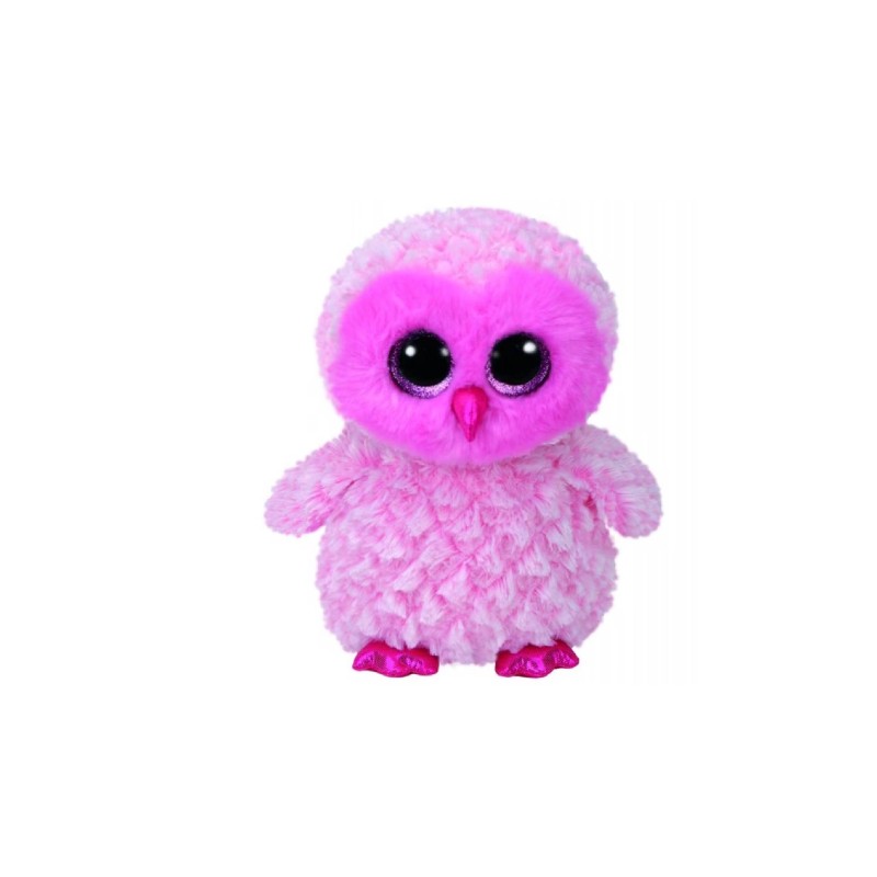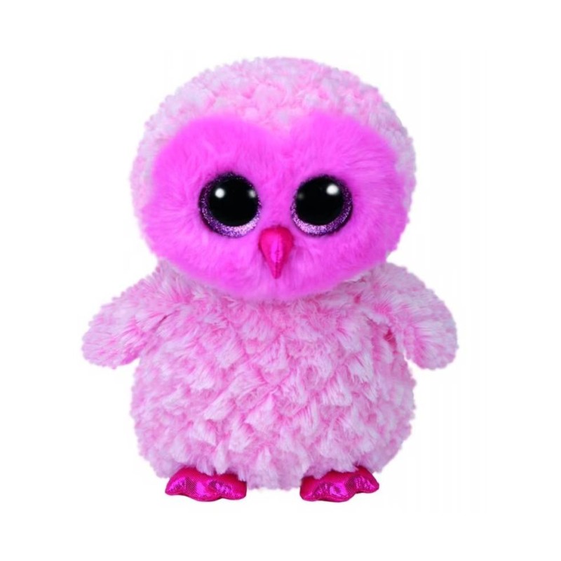 Twiggy is a pale pink fluffy owl with a slightly darker pink fluffy face.