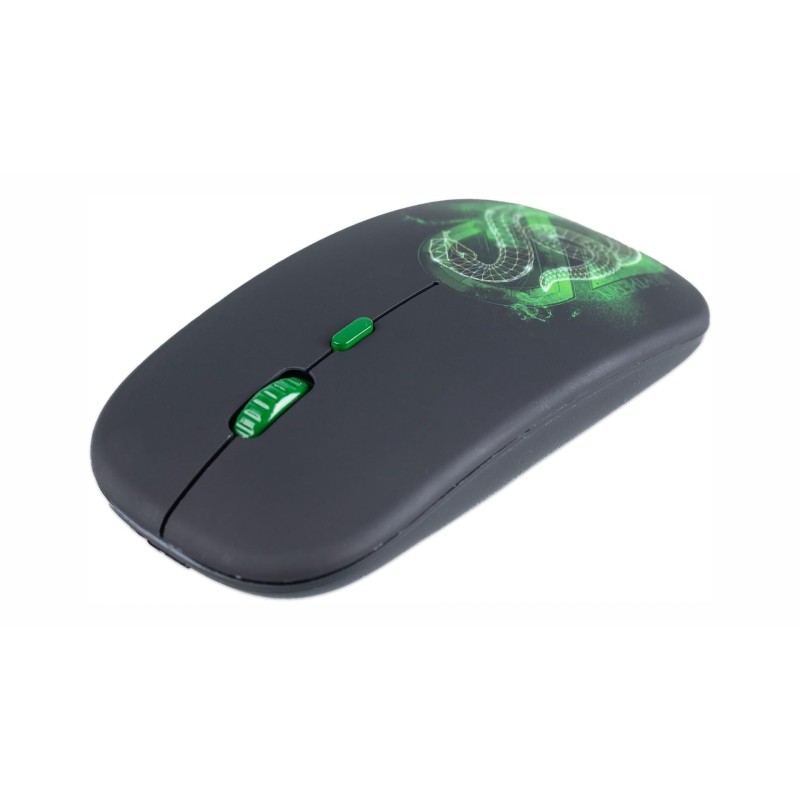 The product in the image is a wireless mouse with the theme of Harry Potter, which represents the house of Vipers (Slytherin).