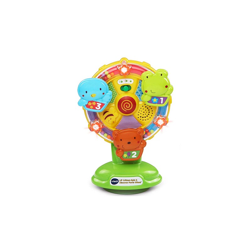Animals also introduce the child to colors and shapes. The wheel plays 10 different happy tunes and 5 songs that the child can sing along to.