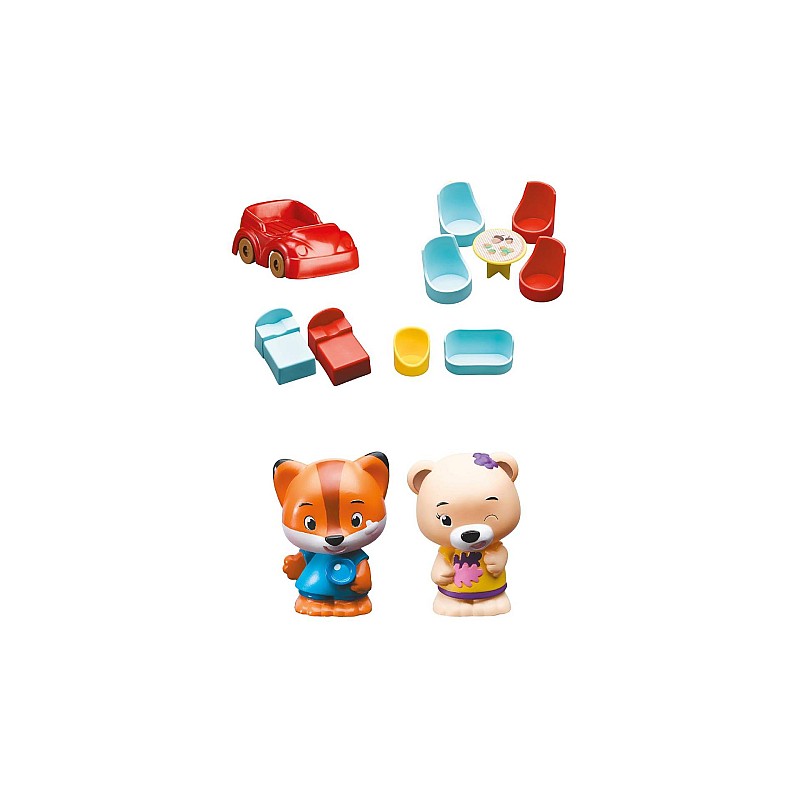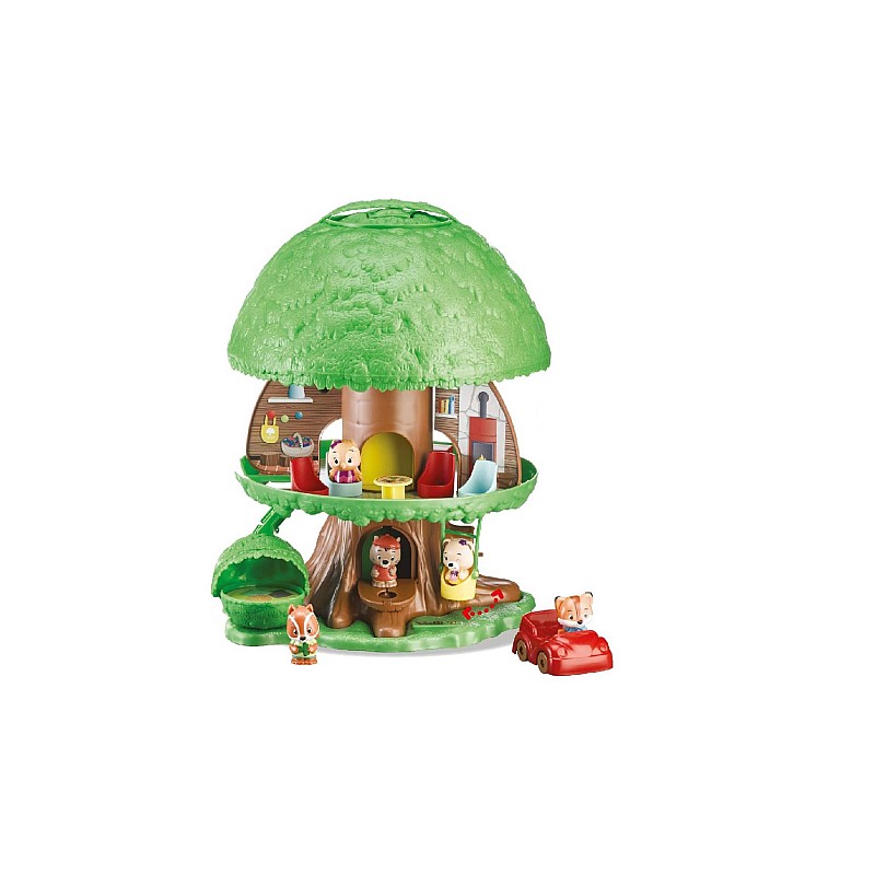 Many activities to discover, to guide the characters in the magical forest: an elevator, a bush with a resting place hidden inside, a slide, a car, a swing.