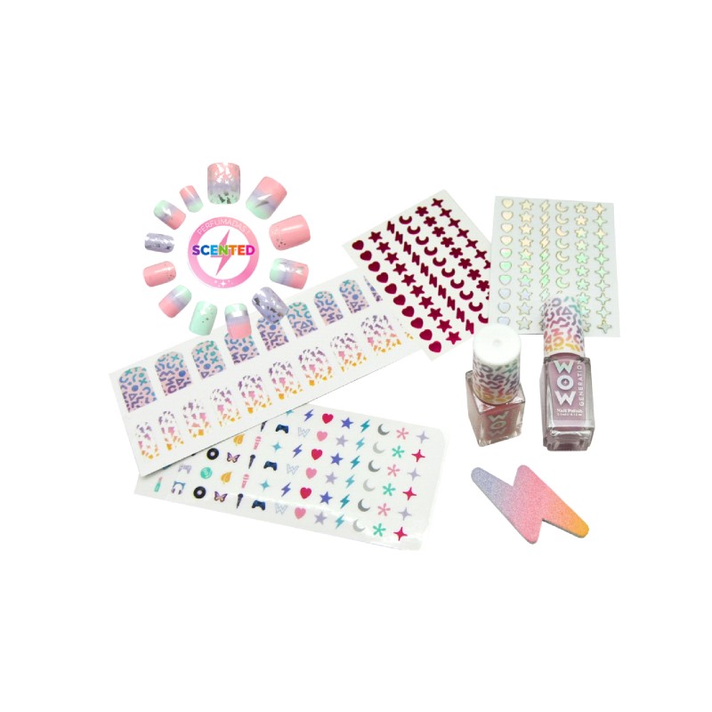 The set includes: scented fake nails, scented and decorative stickers, a WOW lightning file and 2 colors of nail polish, pink and purple.