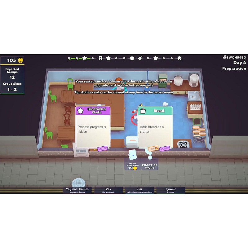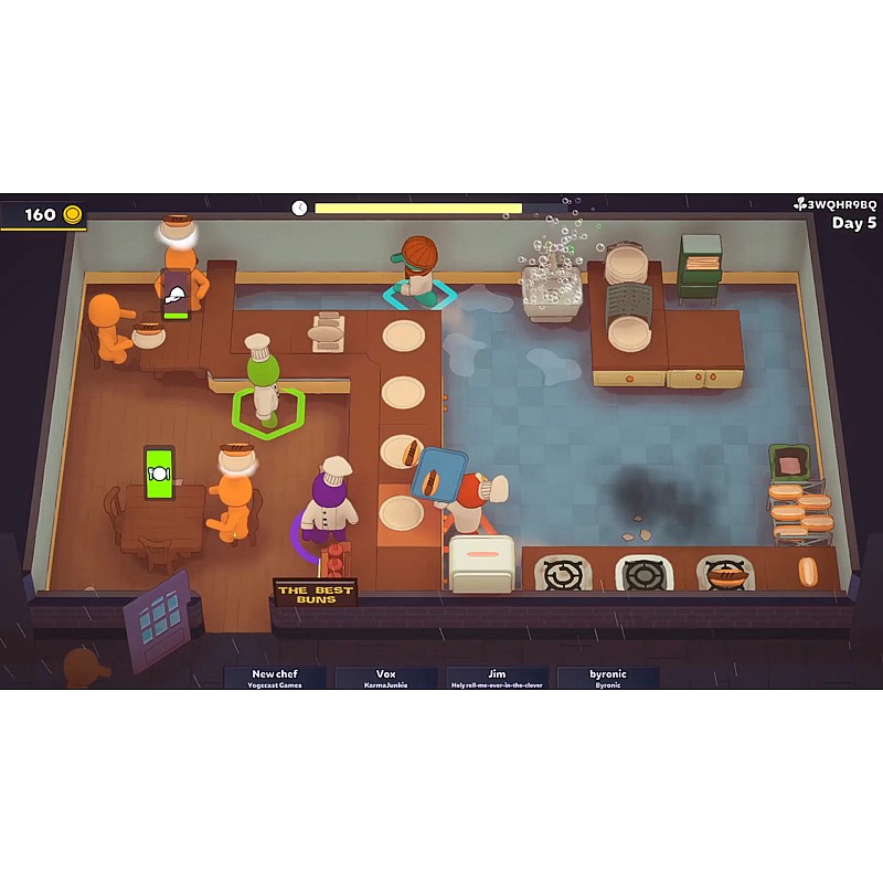 Up to four players build and manage a restaurant from scratch, choosing dishes, buying and placing appliances - some of which can be chained together to create ambitious automated kitchens - that cook food and serve customers.