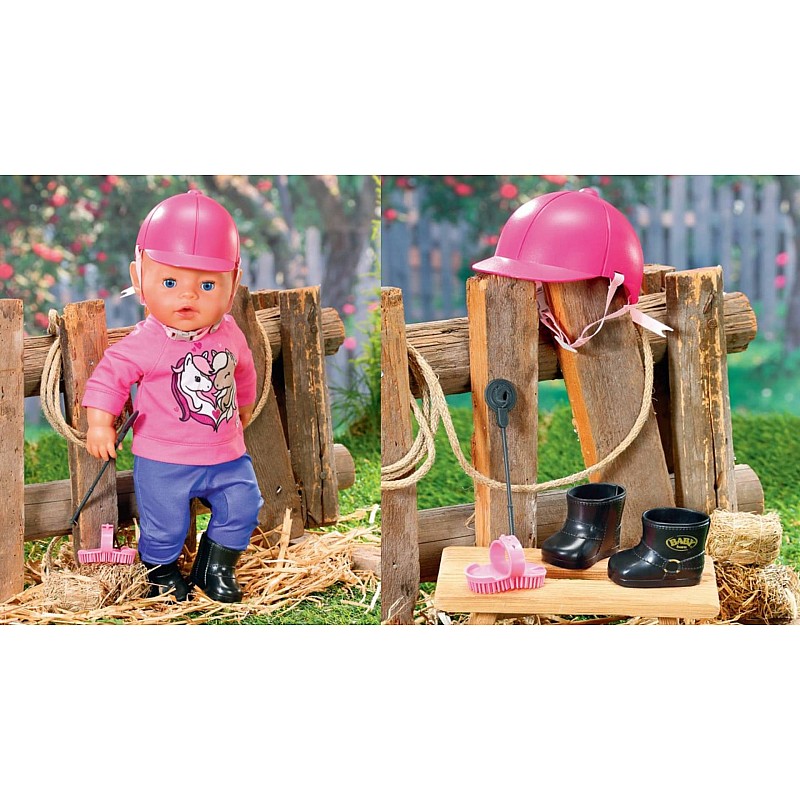 In a pink shirt with a horse print, BABY born is jumping around the farm to get ready for riding.Does not include the doll and pony shown in the images.