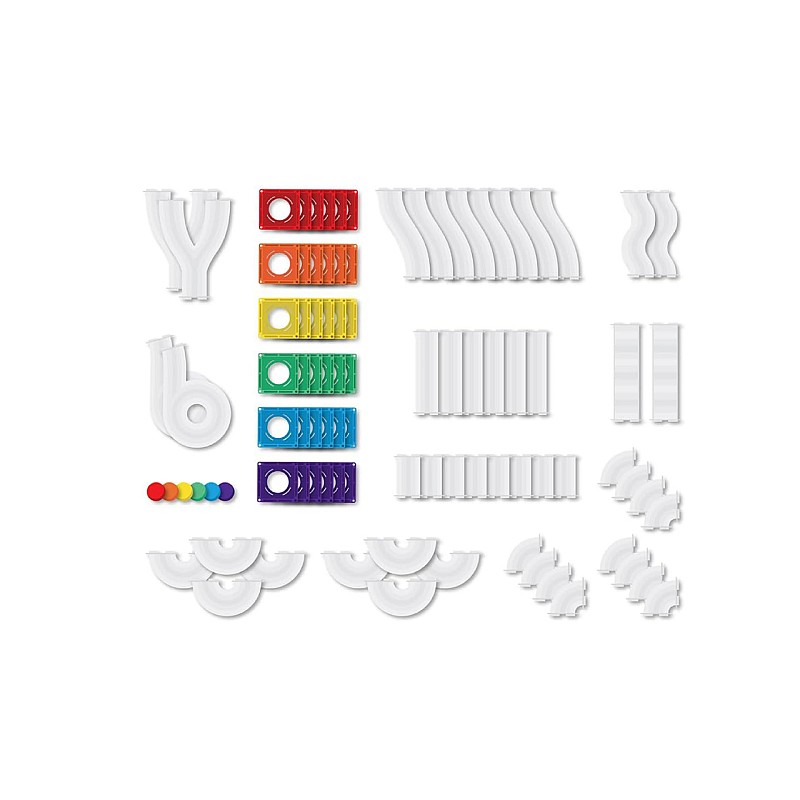 The package contains 36 x connecting squares, 2 x split -shaped tubes, 2 x long staircases, 2 x bent S -shaped tubes, 8 x U U -shaped tubes, 8 x sliding tubes, 12 x right angle tubes, 6 x long straight tubes, 8 x short straight tubes, 2 x bowls and 6 x wooden balls.