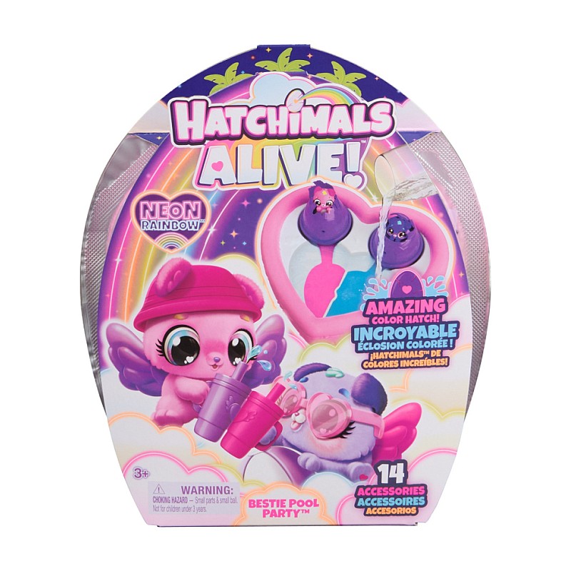 Experience a Hatchimals Alive Bestie pool party. With your love and care, Neon Rainbow Hatchimals come to life with neon eggs that hatch in water, changing the color of water.