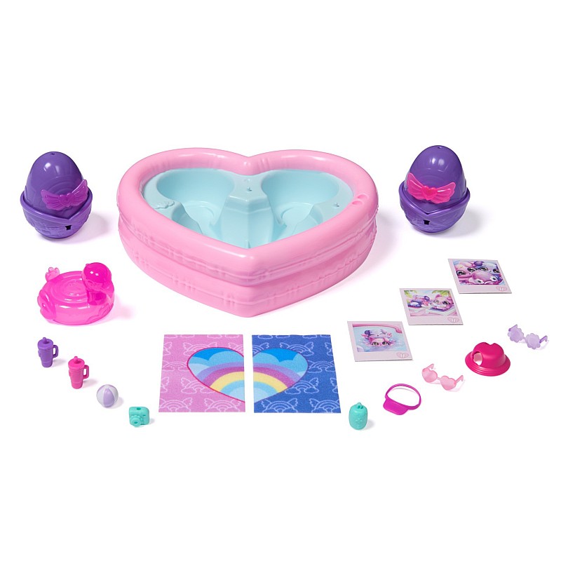 This set includes 2 hatchimals in eggs, a heart -shaped pool and 14 accessories. Before hatching, choose an easy -to -clean place and protect the play area.