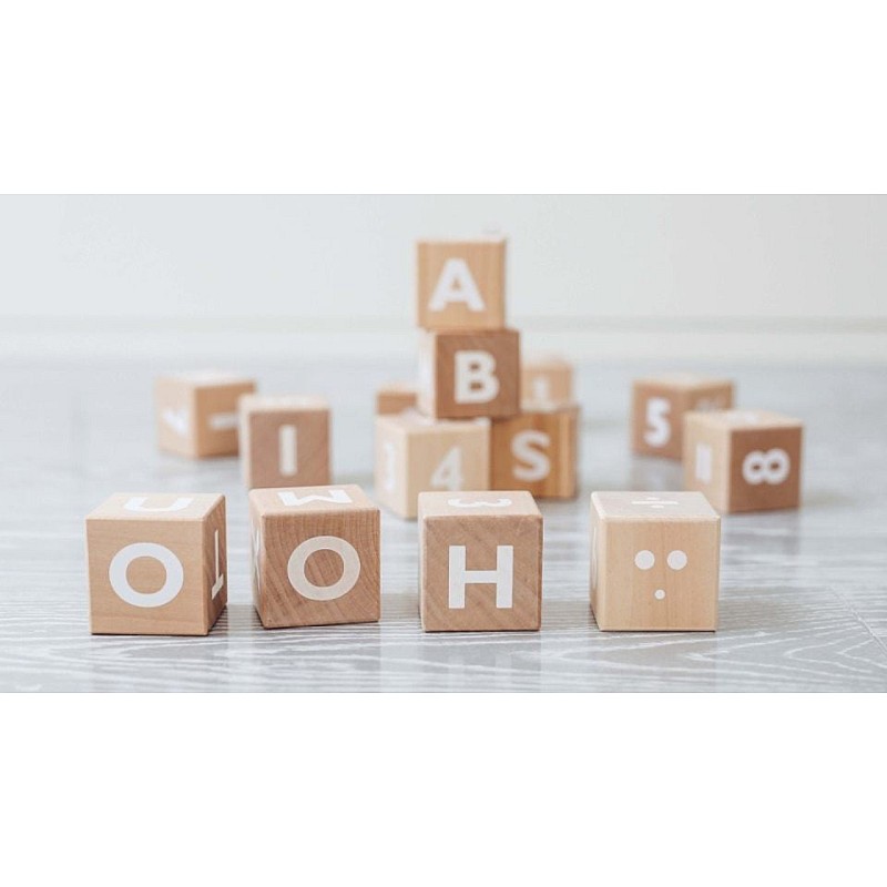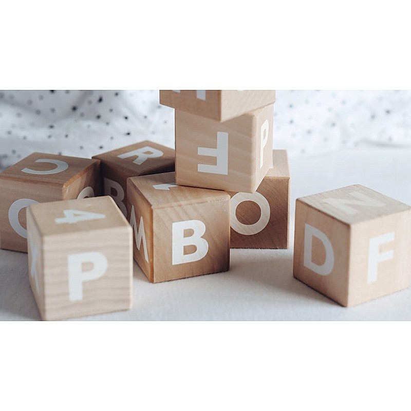 Ten blocks of wooden alphabet in a pure-in-line bag. All the letters of the alphabet in their own bag of pure.