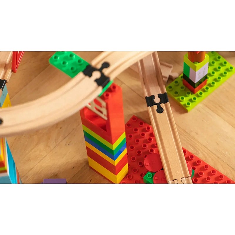 TOY2 rail connectors give beginners and experienced builders the opportunity to create unique structures with plastic building blocks and wooden railways.