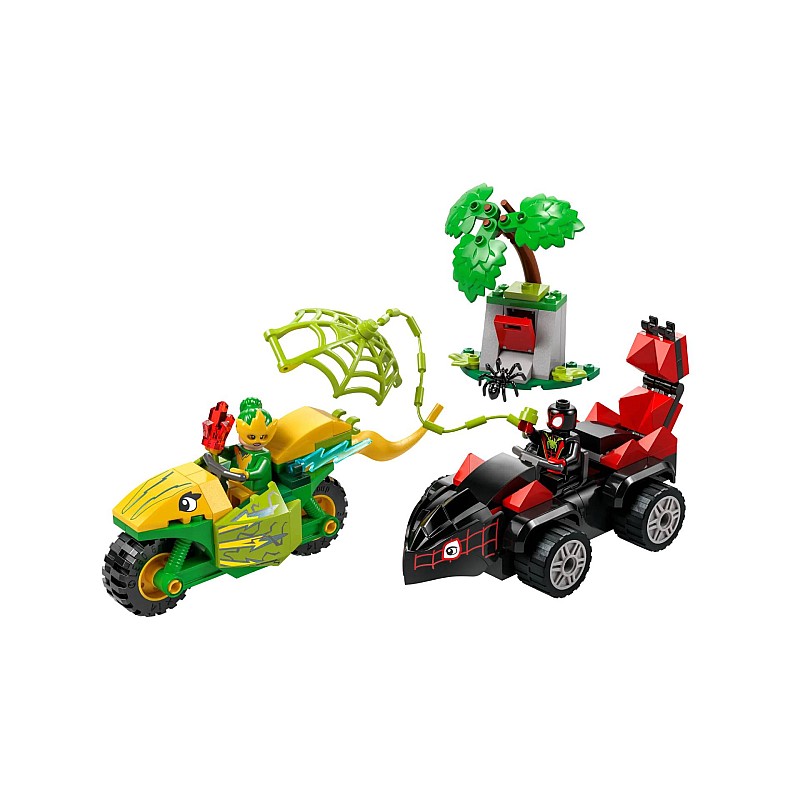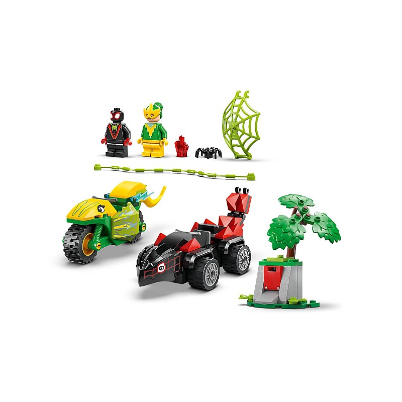 It includes 2 Super Hero and 2 Dino-Vryic minifigurines that push: Miles "Spin" Morales in a flagosaurus car in a Dilophosaurus motorcycle.