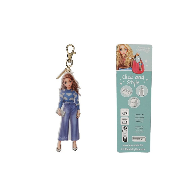 These topmodel pendants are printed on both sides and have a golden carabinier with a logo plate.