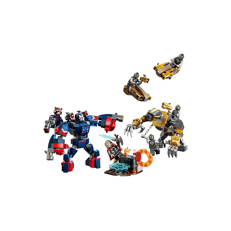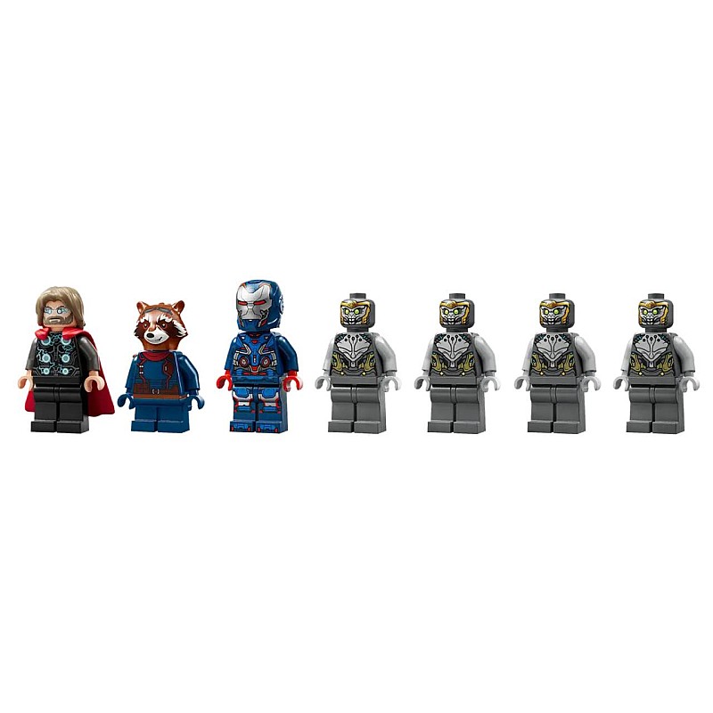 In addition, seven detailed minifigurines include, including Iron Patriot MK2, a rocket with a large bolt thrower, Thor armed with Stormbreaker, and four guitars, two of whom are equipped with golden bolts.