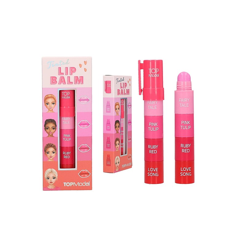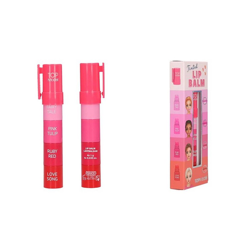 A TopModel ajakbalzsam 4 egyéni színű ajakbalzsamból áll, vöröstől rozig, amelyek egymásra vannak rakva.