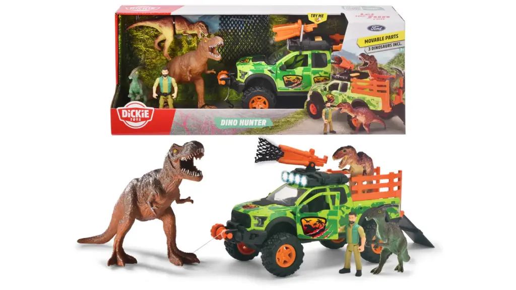 A dinoszauruszok megszöktek! Szerencsére az erdőőr akcióra kész Ford Raptor terepjárójával (hivatalos Ford jogosítvánnyal, 1:24-es méretarány) és ketreces utánfutójával, amellyel megörökítheti az óriásokat a dzsungelben.