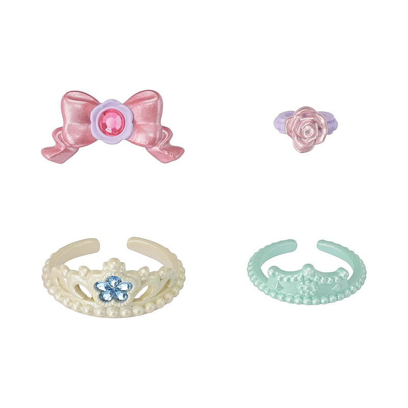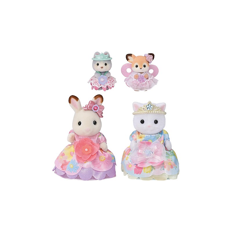 Mindegyik figurát hercegnő ruhákba öltözik virágokkal, és olyan kiegészítőkkel érkeznek, mint a tiara, a szalag, a kis tiara és a fülbevalók.