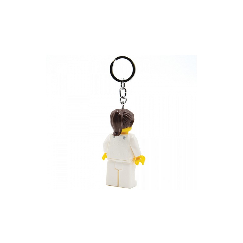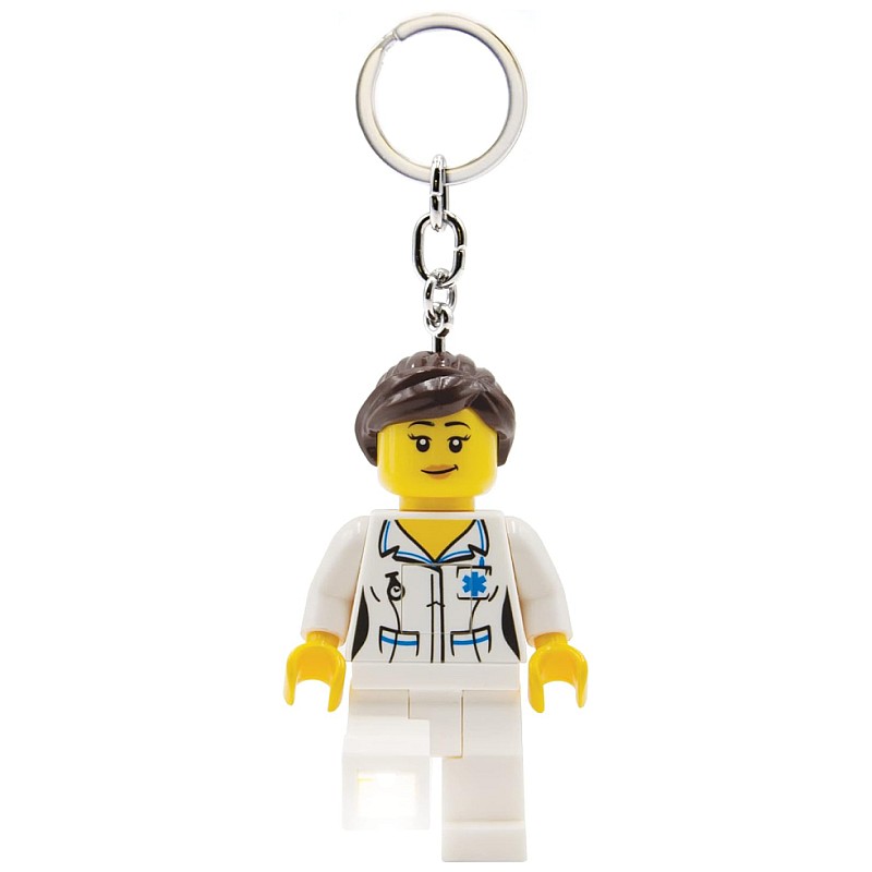 Lego kulcstartó nagy nővér minifigurával, működtethető karokkal, izzó Led lámpával mindkét lábában és a testen egy gombbal, amellyel felkapcsolhatja a lámpákat.