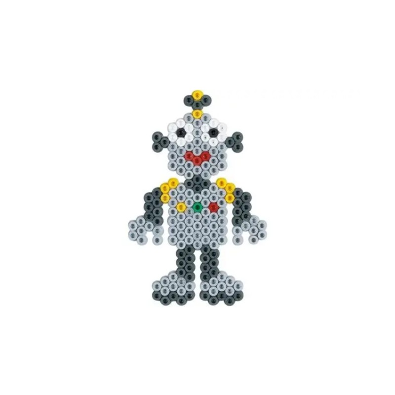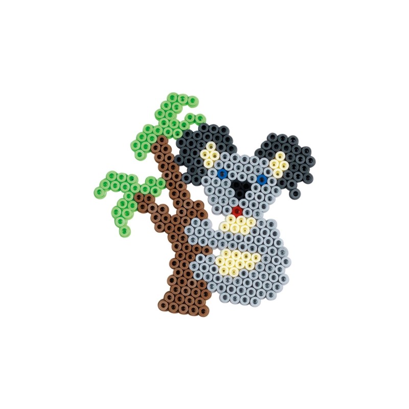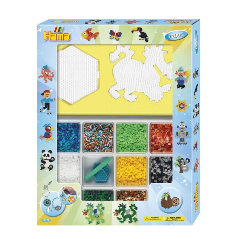 A Hama Iron-on Bead Set ajándékdoboz 7200 vasalható gyöngyöt, 4 vasalódeszkát, 6 vasalható gyöngytartót, 1 szerszámot, 1 cérnát, színes mintákat, használati utasítást, vasalópapírt és egy fedeles tárolódobozt tartalmaz.