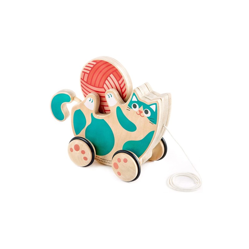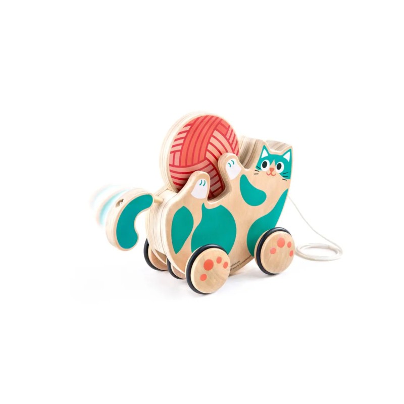 Amikor a gyerek húzza a macskát, az csóválja a farkát, miközben a fonalgolyó a macska mancsai között forog.