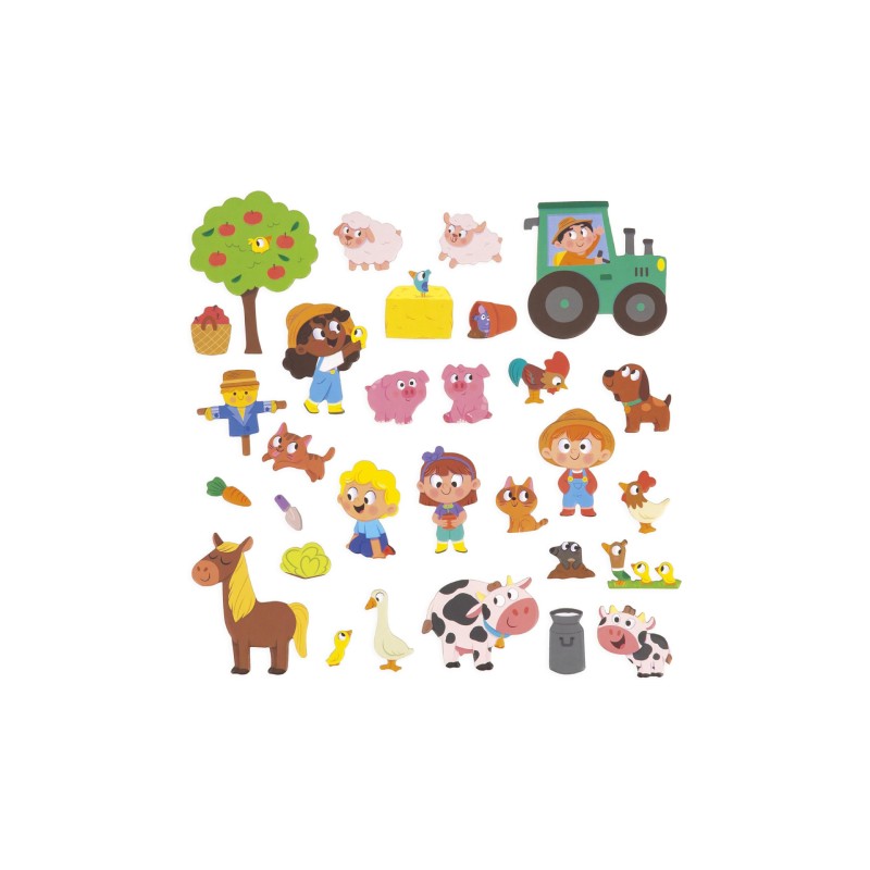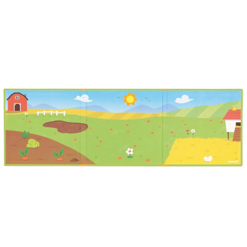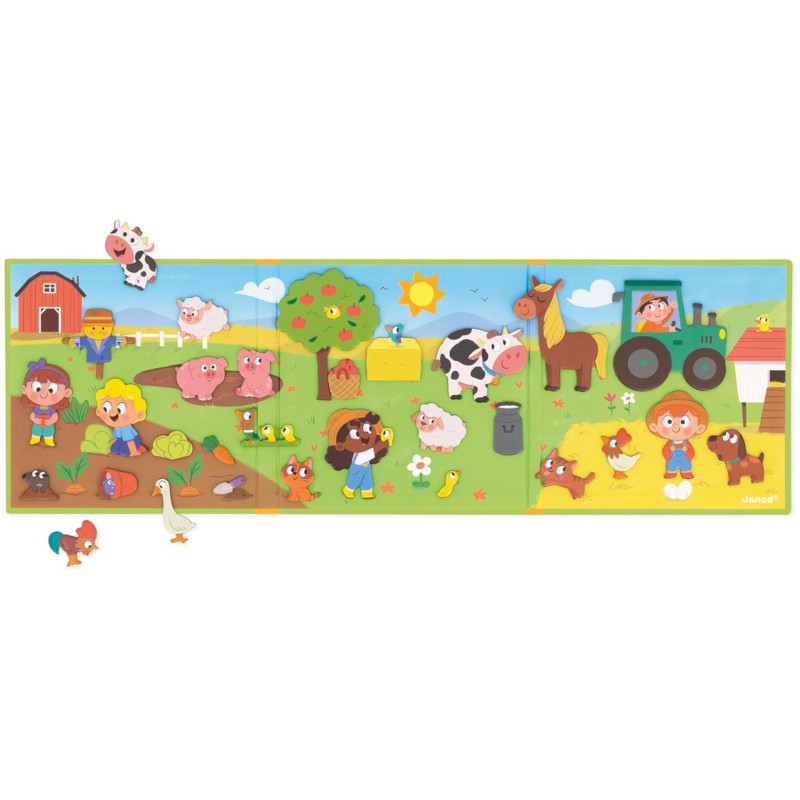 Ez a Janod játék 30 mágnesből áll, mezőgazdasági termelők, zöldségek, állatok és egyéb elemek formájában, amelyeket el kell helyeznie a nagy színes háttérre.