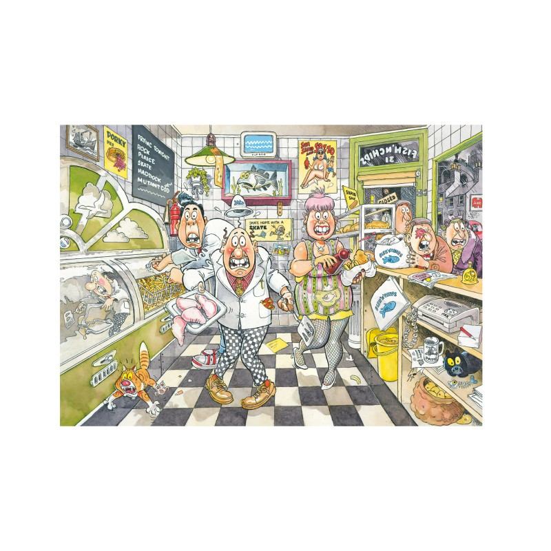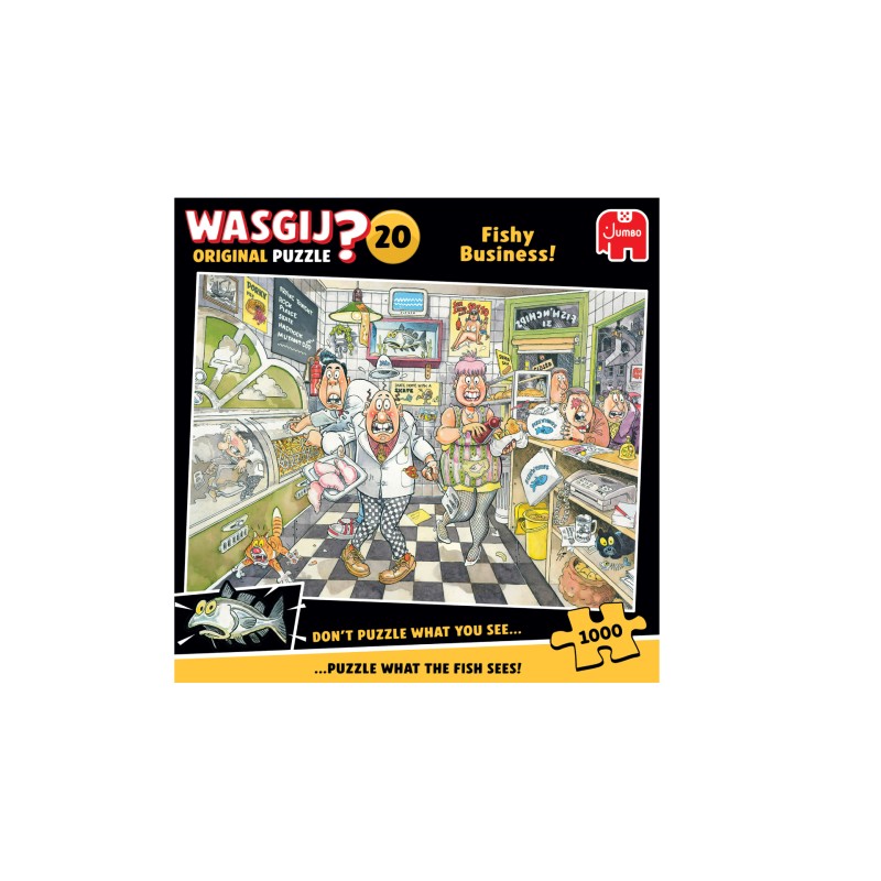 Ez a Wasgij Original 20 puzzle a "Fishy Business" témájával 1000 darabból áll, és érdekes kétdimenziós képet hoz létre.