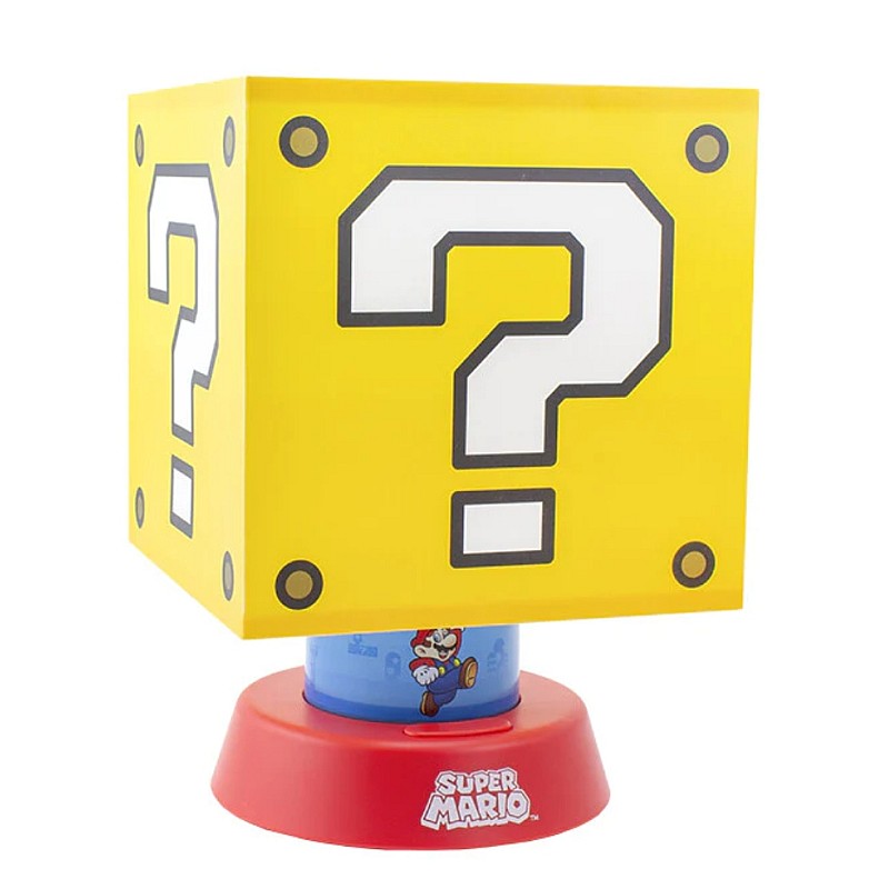 A kérdőjel alakú lámpa egy kerek piros alap tetején helyezkedik el, egy gyönyörű kék szalaggal, amelyet a Super Mario világának képei díszítenek.