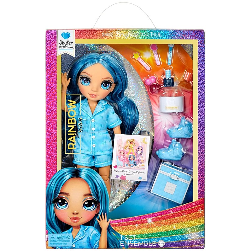Skyler egy imádnivaló kétrészes szatén pizsama szettben és a hozzáillő kék mackópapucsban van felöltözve.
