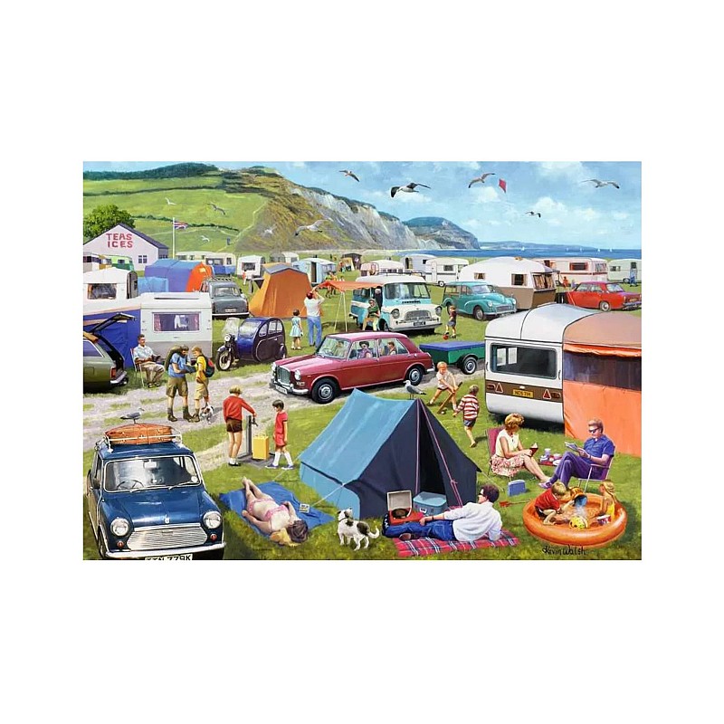 Ez a részletes dizájn megragadja a brit kempingezés és lakókocsizás iránti szeretetet, és Dorset lenyűgöző Jurassic Coastja tökéletes hátteret biztosít ehhez a boldog jelenethez.