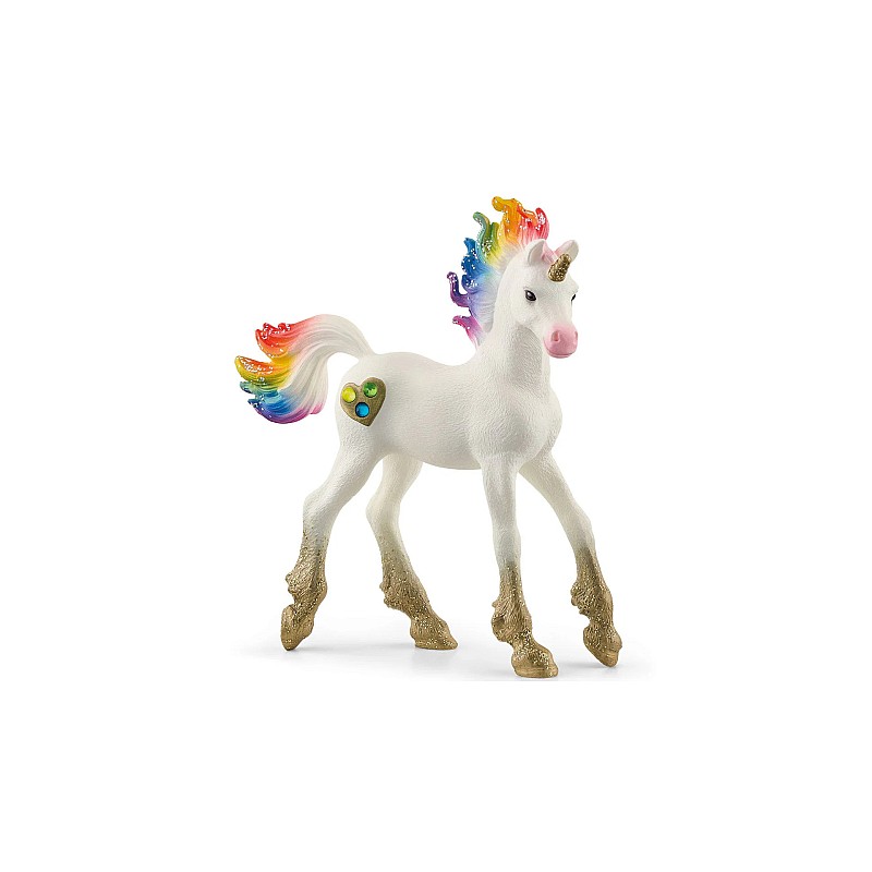 A játékos egyszarvú állkapocs vidáman ugrik át a réten, és a vad gerincét a szivárvány színeiben rázza.