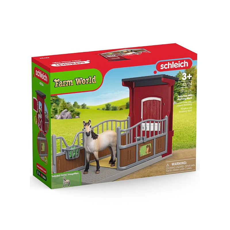 A Schleich ponybox -szett Mustang Mare -val előtérbe helyezi a Mustang részletes figuráját, amelyhez stilizált szállítódoboz tartozik.