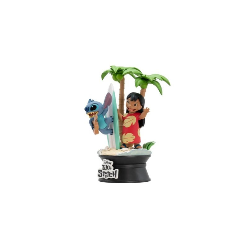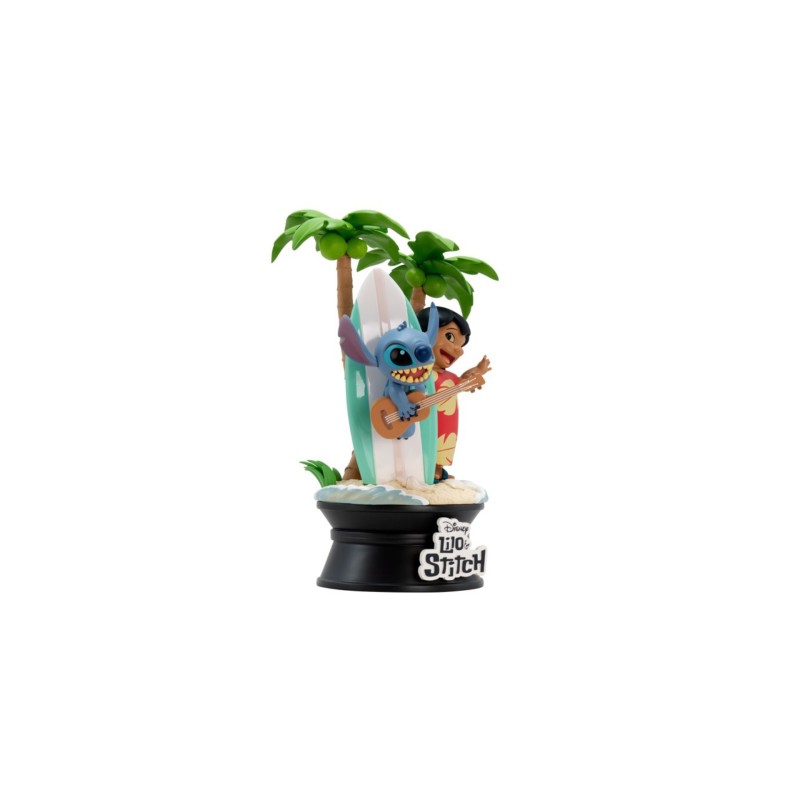 Înconjurat de valurile oceanului și de palmieri tropicali, răutăciosul Stitch se agață de o placă de surf în timp ce ține în mână ukulele-ul său preferat.