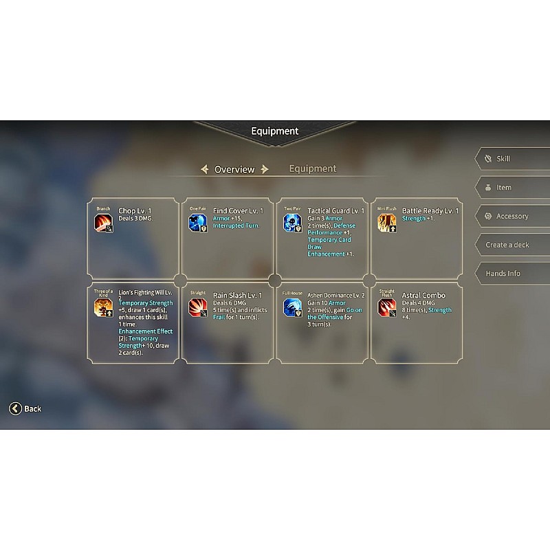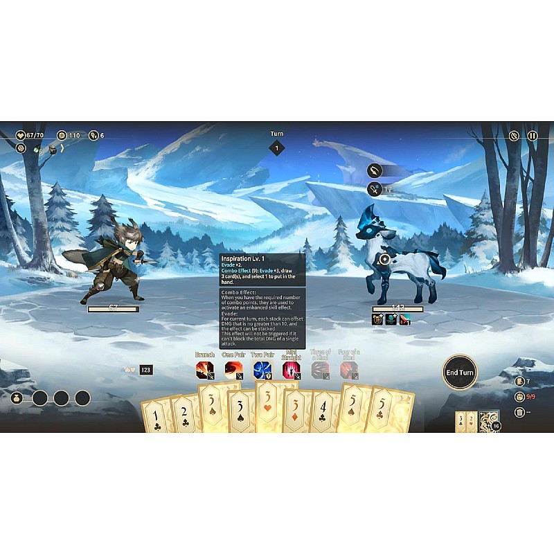 - Folosește pachetul de cărți de joc pentru a-ți activa abilitățile, pentru a ataca inamicii și pentru a te apăra cu combinații de cărți, cum ar fi două perechi, un full sau o chintă de culoare.