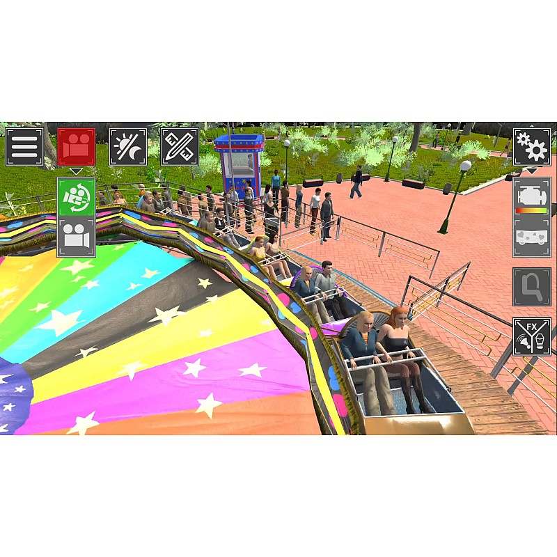 Gestionați capacitatea fiecărei călătorii și adăugați efecte de lumină și fum spectacolului. În plus, la fiecare atracție, puteți alege dintre camere diferite și chiar să le experimentați prin ochii pasagerilor.