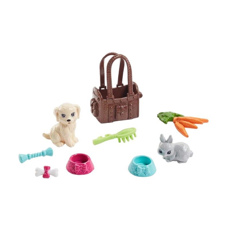 Include păpușa Barbie cu haine și accesorii, câine, iepure și accesorii tematice.
