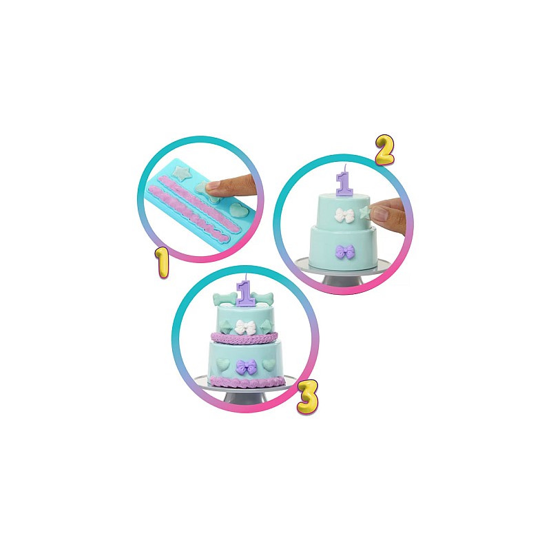 Setul include un cățeluș adorabil, aluat colorat, forme pentru decorarea tortului și 8 accesorii inspirate de aniversări, dintre care două își schimbă culoarea.