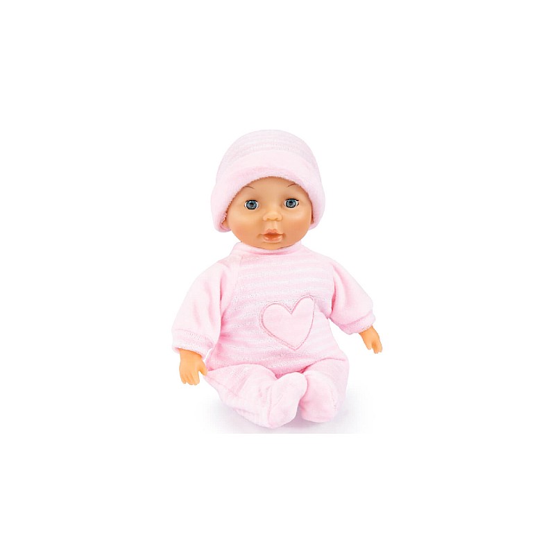 Păpușa bebeluș poartă un combinezon drăguț cu șapcă asortată și are un petic drăguț in forma de inimă pe piept.