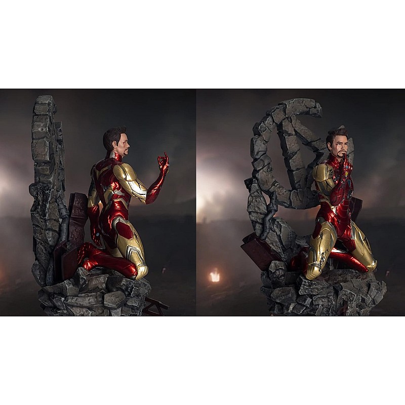 În poza de acum faimoasă, Iron-Man în costumul lui Mark-85 este văzut îngenuncheat pe pământ, gata să pocnească din degete.