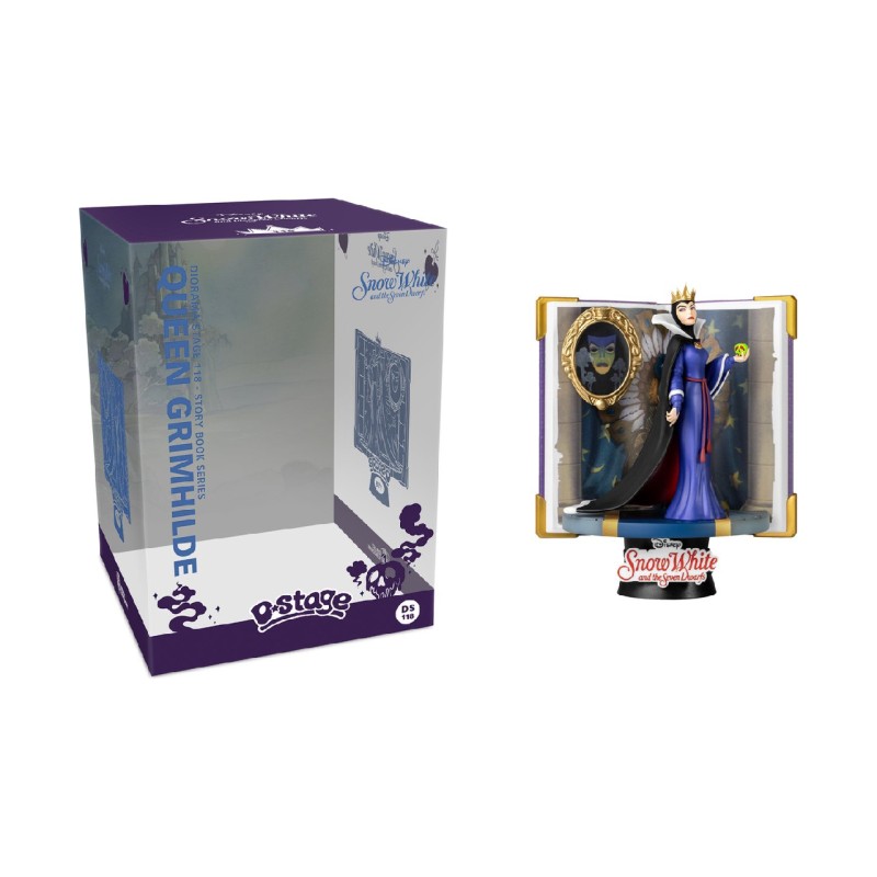 Văzută aici cu mărul otrăvit în mână și cu infama oglindă în spatele ei, Grimhilde radiază de răutate pură.