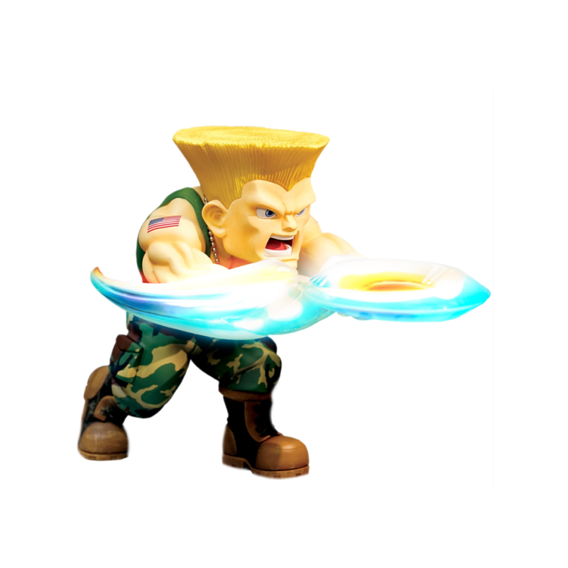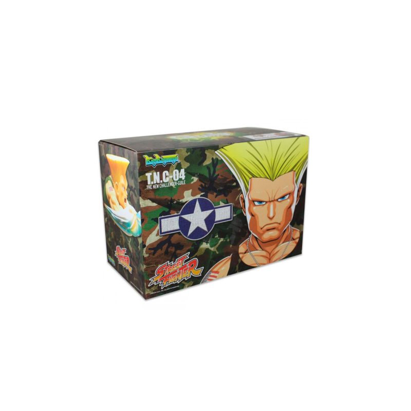 Street Fighter The New Challenger Guile este o figurină din PVC pre-vopsită, fără scară, cu licență oficială, care dispune de lumină LED și efecte sonore.