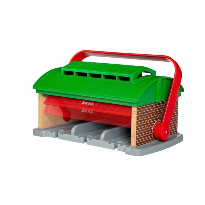 Garajul pentru trenuri cu mâner este un accesoriu excelent pentru orice cale ferată BRIO World, oferind trenulețelor de jucărie locul perfect pentru întreținere și odihnă.
