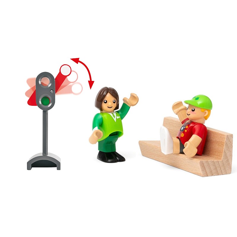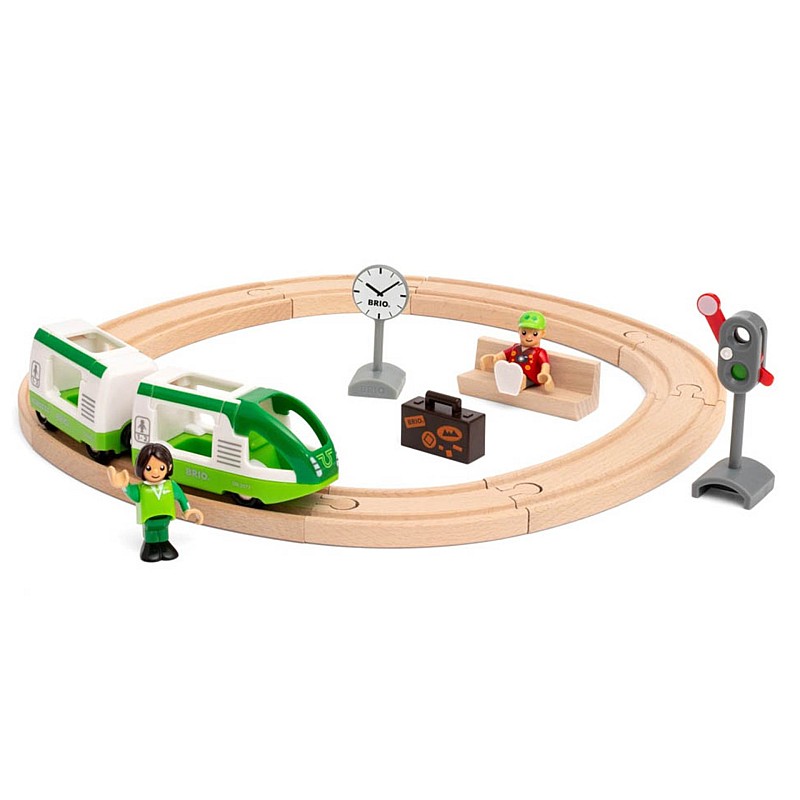 Acest set de tren include șine de tren din lemn, un tren de pasageri cu vagon, două figurine și alte accesorii feroviare.