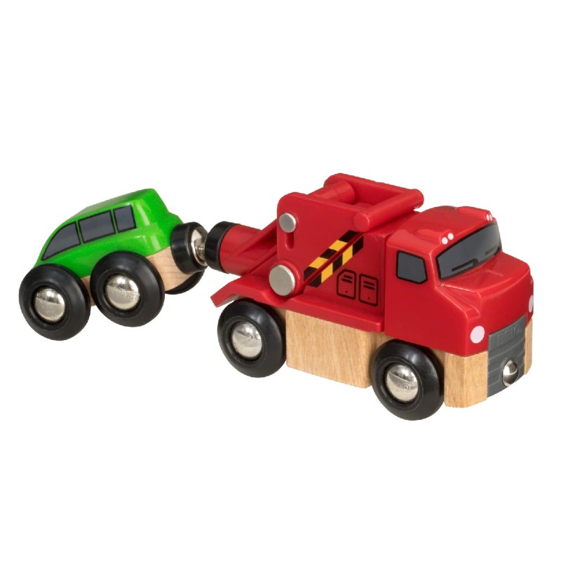 Lasa camion de tractare de la BRIO sa vina sa te salveze, doar trage manerul din spate a camionului de tractare pentru a ridica masina de pe sol folosind cuplarea magnetica si tracteaza!