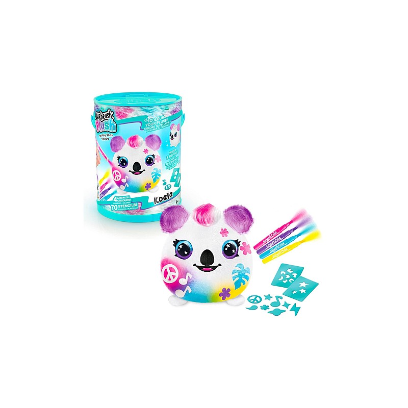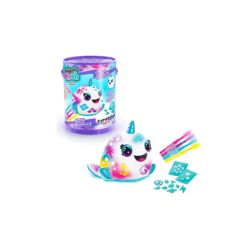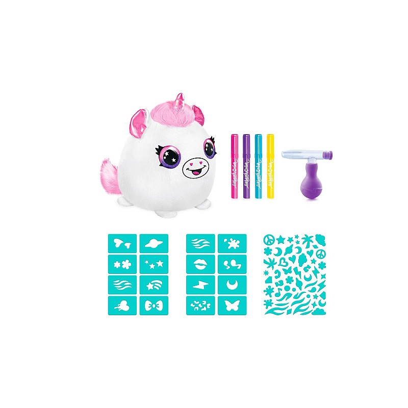 Include: 1 pluș moale, 1 pompă de pulverizare, 4 culori pentru aerograf, 1 pereche de mănuși, 70 de șabloane adezive reutilizabile, 1 manual de instrucțiuni.