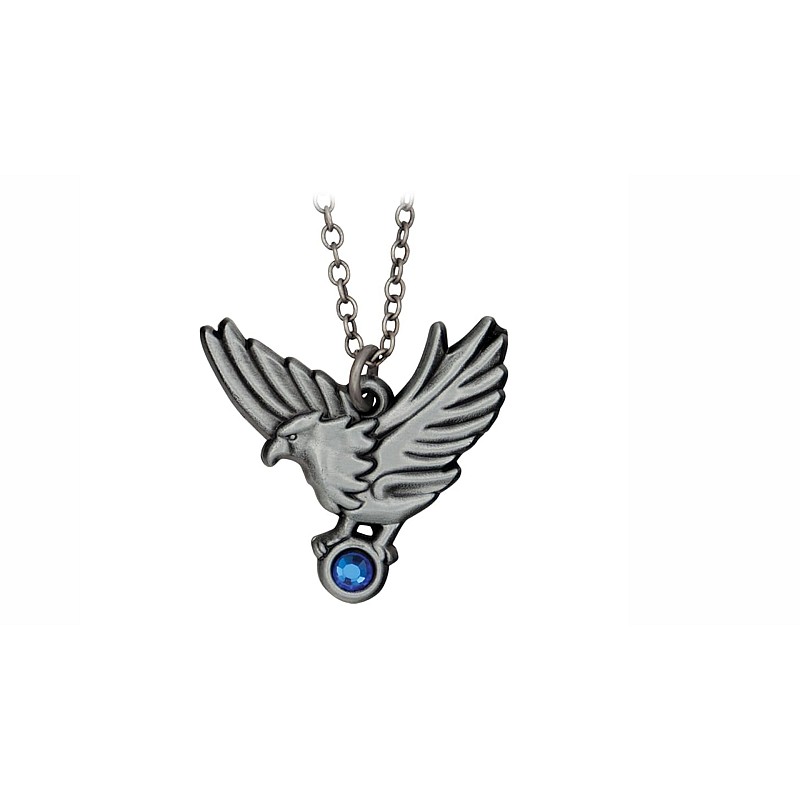 Cu detalii complexe, acest colier din metal are și o mică bijuterie albastră purtată de pasăre.