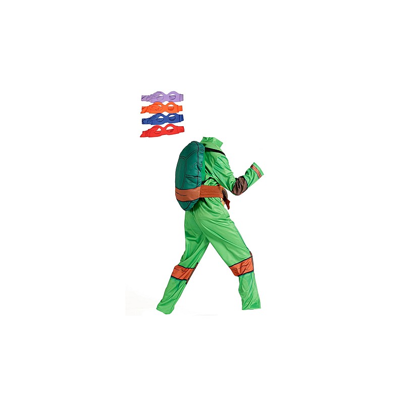 Setul constă intr-un costum complet, 4 măști diferite pentru ochi, astfel încât să poți alege ce personaj vrei să fii și un rucsac cu pernă pentru a arăta ca o adevărată Țestoasă Teenage Mutant.
