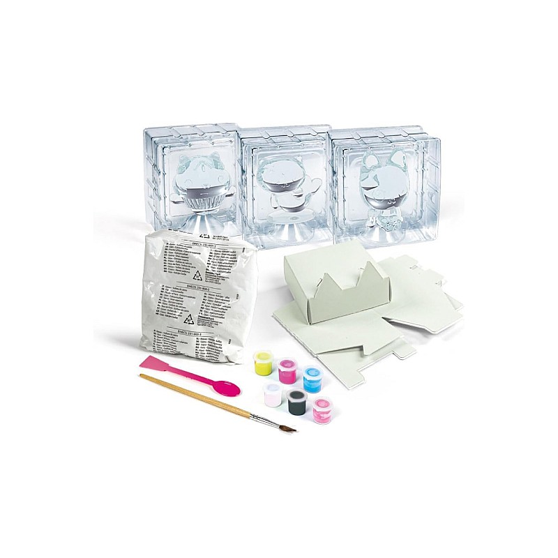 Jocul include matrițe ambalate în vid și ipsos de Paris pudră, plus vopsele pentru a realiza creații fantastice.