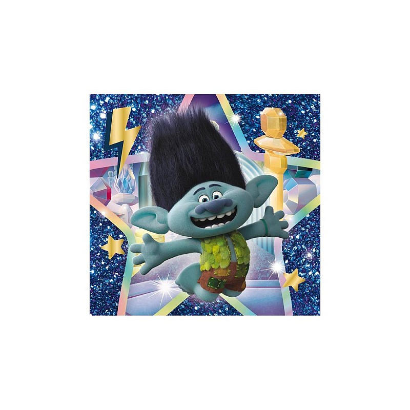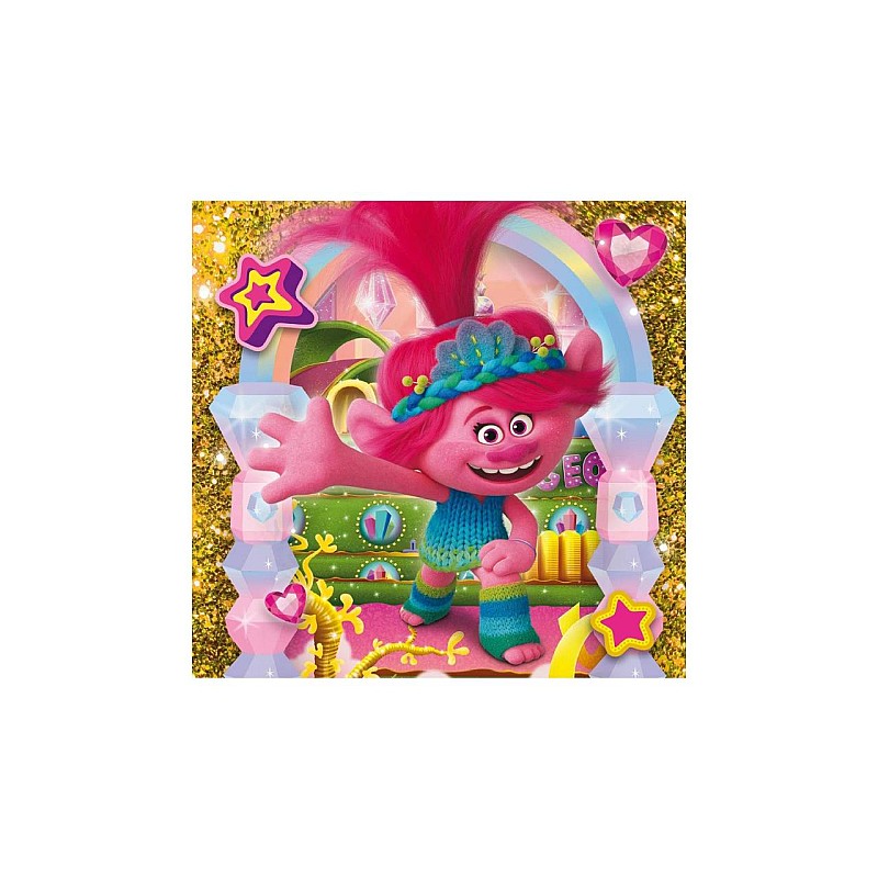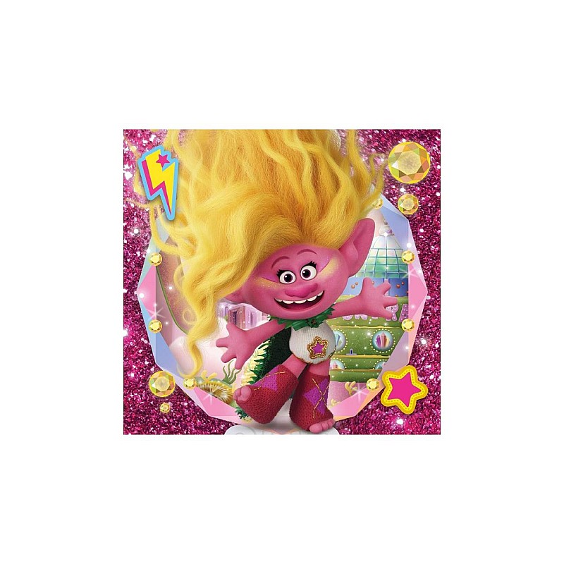 Fiecare imagine a puzzle-ului reprezinta personajele principale din filmul de animatie Trolls 3, pe imagini stralucitoare si sclipitoare, ceea ce face asamblarea si mai interesanta.