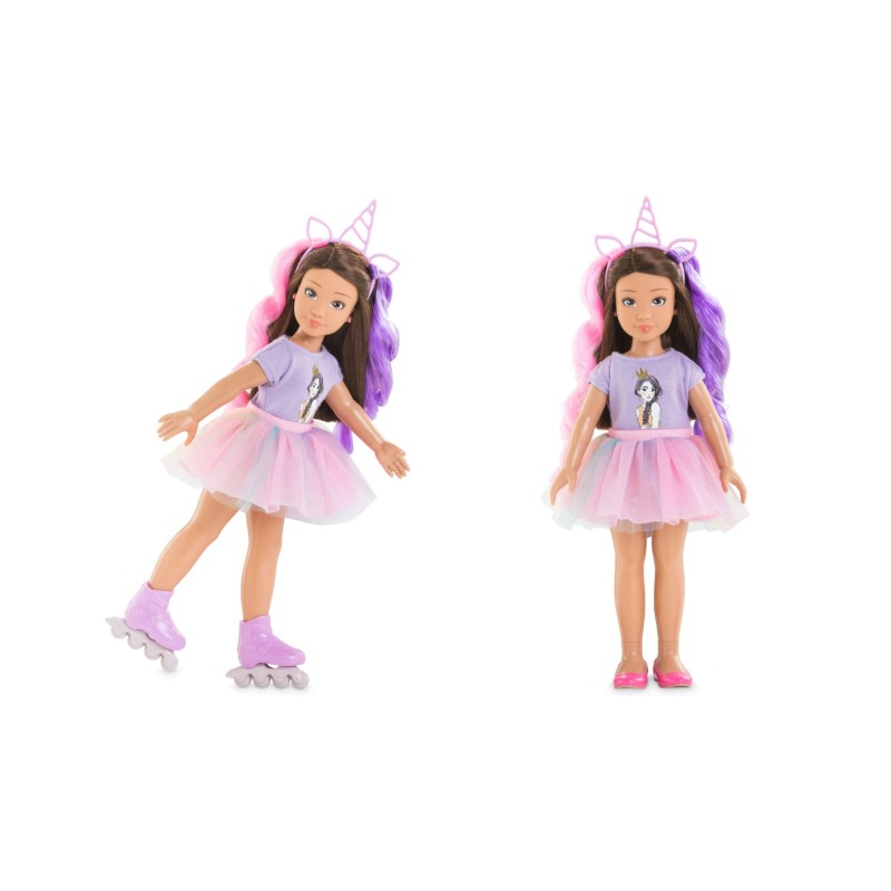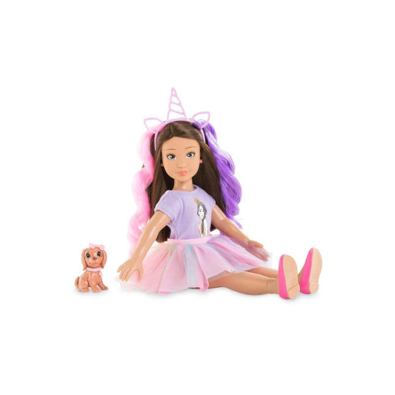 Păpușa Corolle numită Luna are părul lung și castaniu și este îmbrăcată într-o rochie drăguță cu fustă de corp colorată, care poate fi îndepărtată complet.