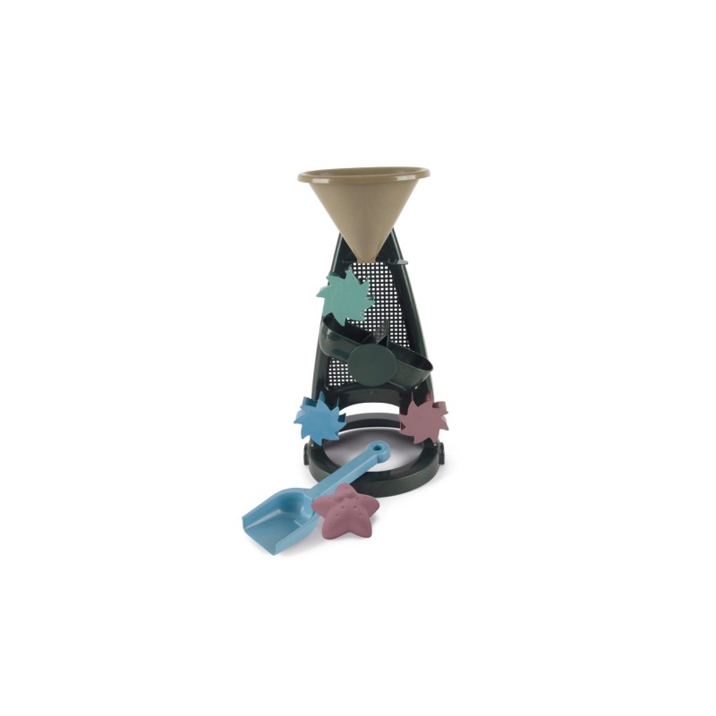 Un set bun cu o lopată, o formă de nisip și o moară mare prin care pot curge atât nisipul, cât și apa.