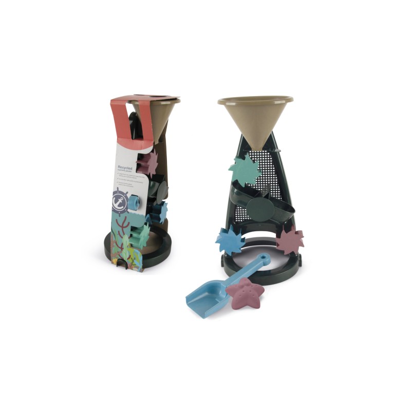 Setul cu nisip și apă este o jucărie de la dantoy, fabricată în Danemarca, din materiale reziduale reciclate din utilizarea maritimă.