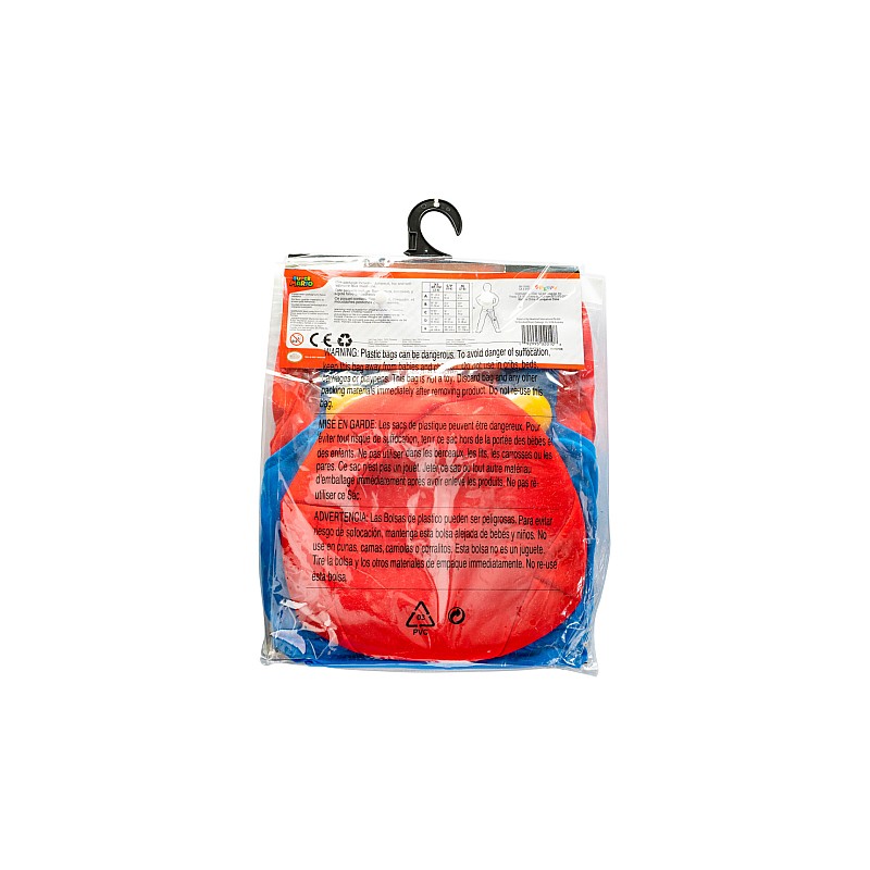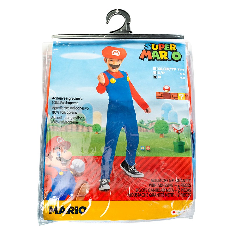 Costumul include o salopetă dintr-o singură piesă din poliester, cu salopetă și nasturi falși, mustață moale din fetru adezivă și interlock combinate cu o pălărie Mario din spumă cu aplicație cu emblema M.