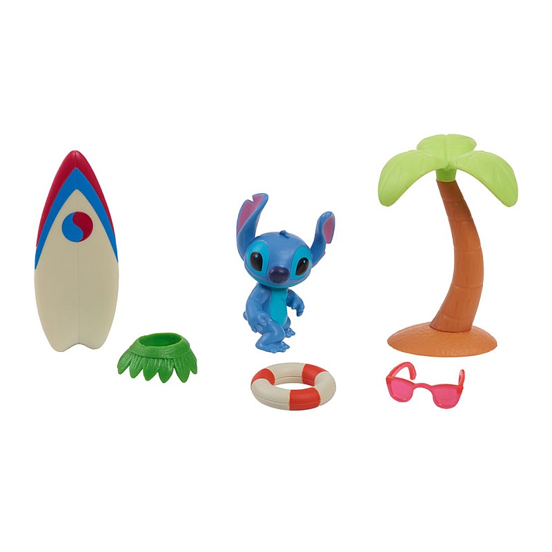 Set de joacă Stitch, care conține o figurină reprezentând personajul Disney Stitch și include o placă de surf, un palmier, o vestă de salvare și o pereche de ochelari de soare este aici.